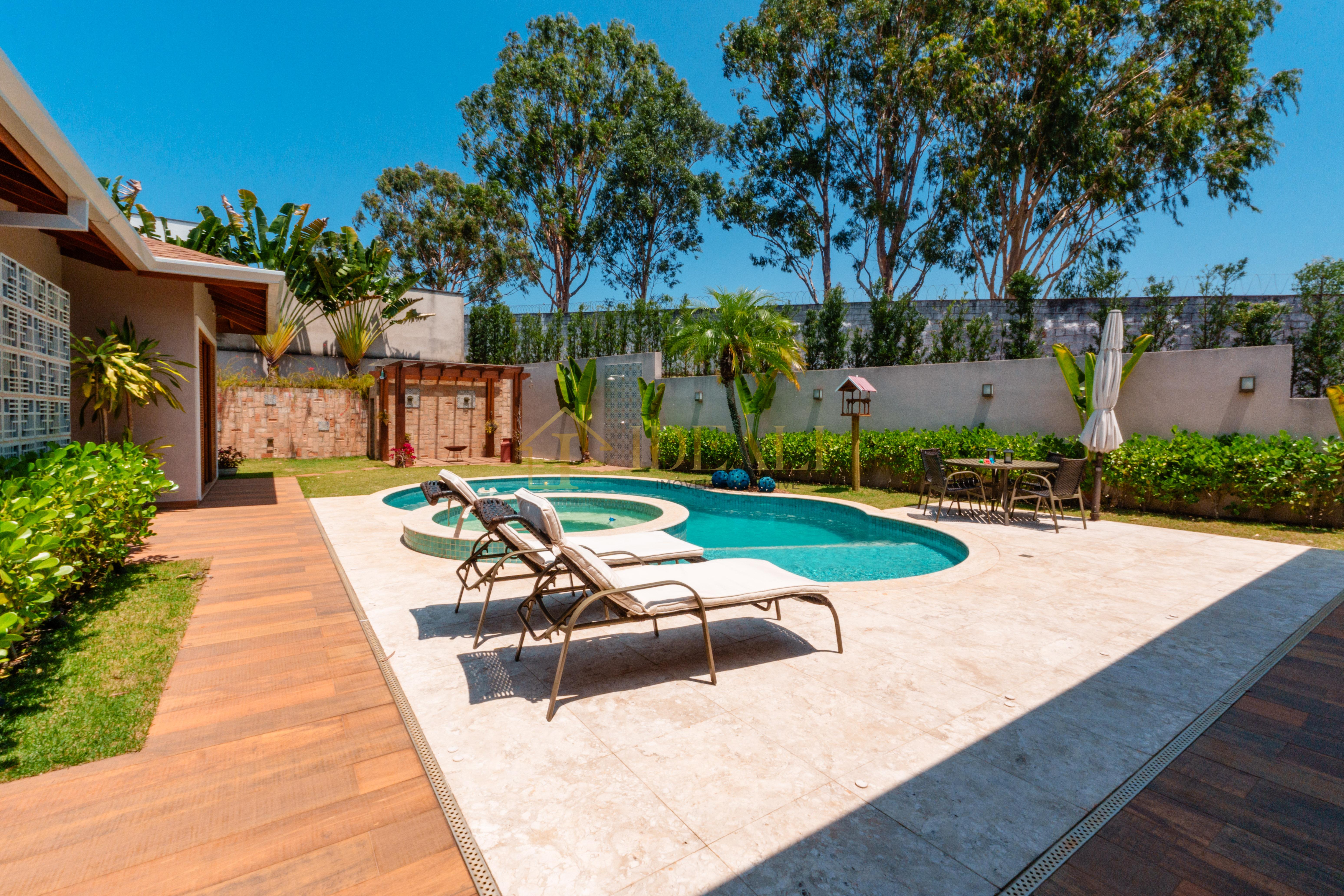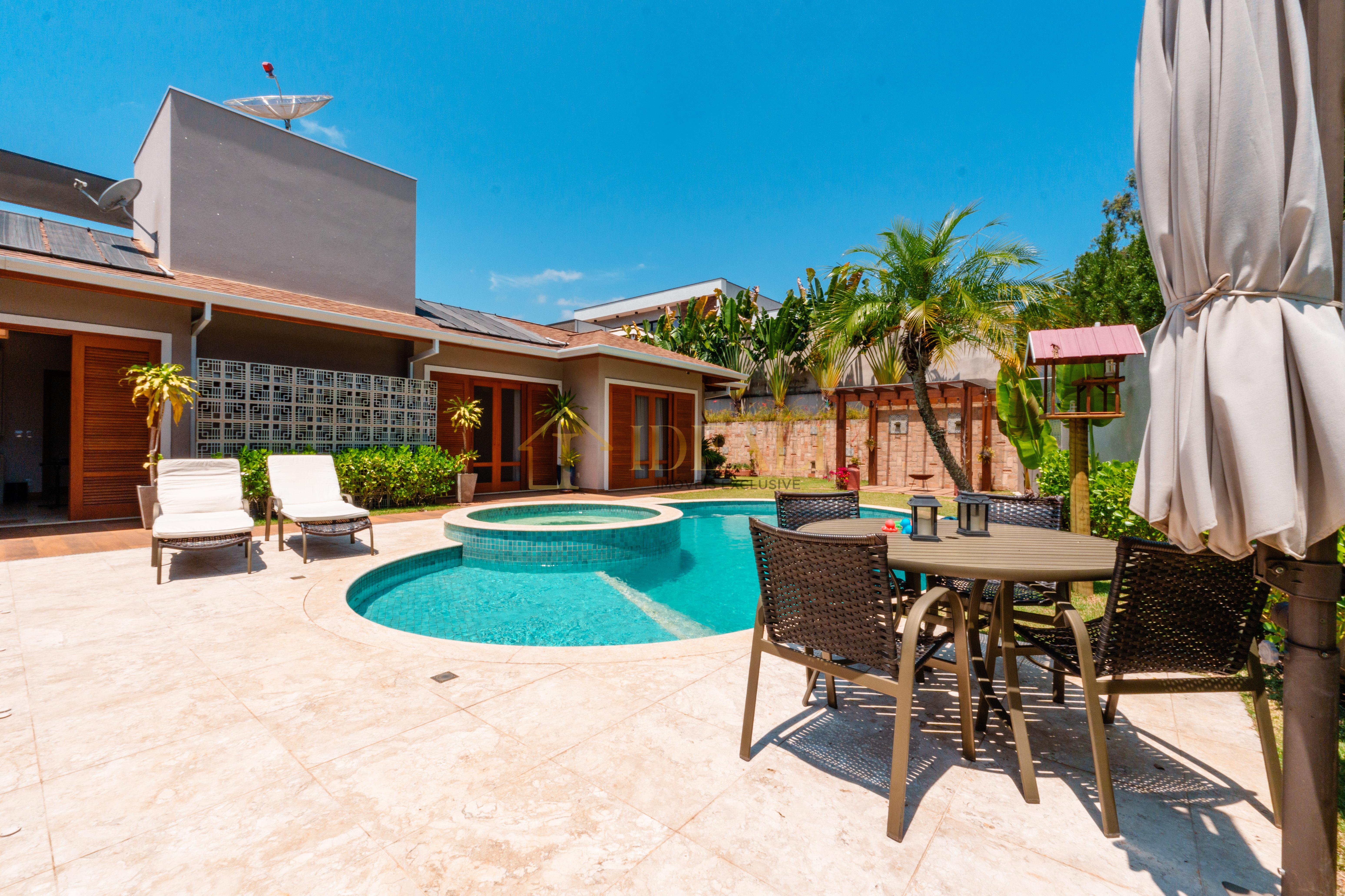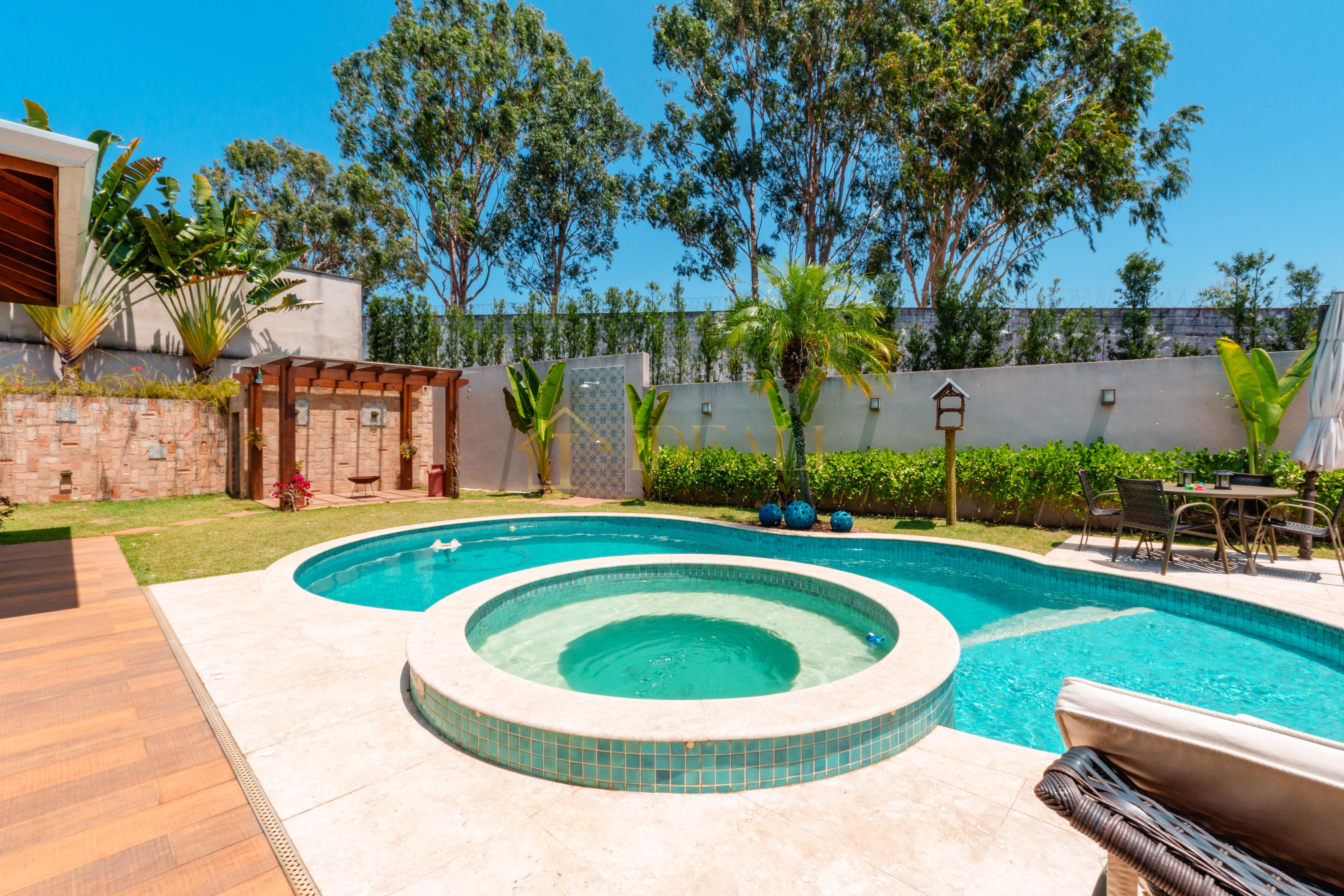 São 355 metros de área construída e 793 metros quadrados de área de terreno, abrigando uma casa com 3 suítes amplas, três salas, cozinha americana, despensa, lavanderia, piscina e jardim gramado, além de uma garagem coberta para dois carros.